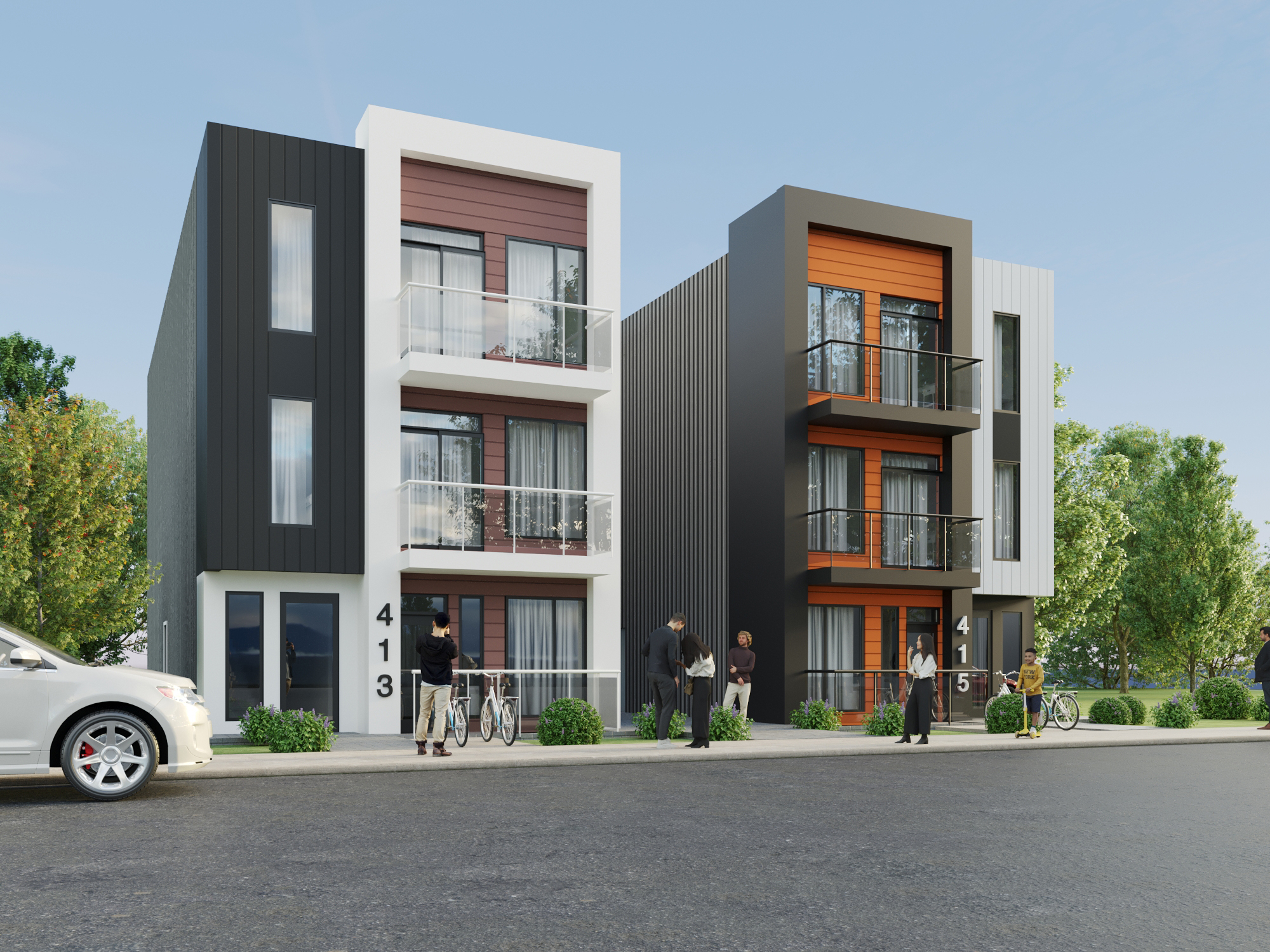 1This proposed development introduces two three-storey low-rise apartment buildings, each containing eight residential units, in Ottawa’s centrally located Sandy Hill neighbourhood. Situated within walking distance of rapid transit, the University of Ottawa, and a range of urban amenities, the project supports sustainable, car-free living in a highly walkable setting. The buildings are oriented to enhance the public realm, with pedestrian-friendly frontages and landscaping that reinforces the character of Besserer Street.